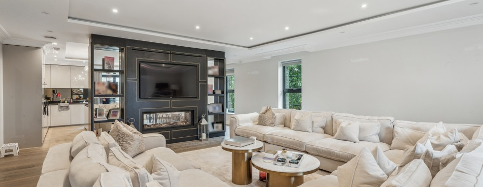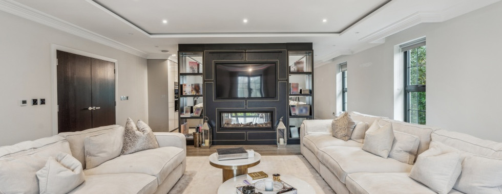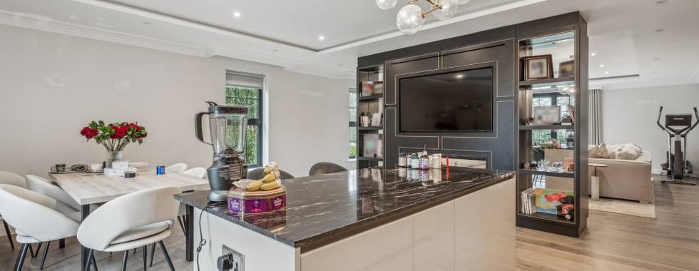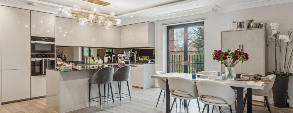 The kitchen is fitted with top-tier appliances, including integrated Miele equipment, a sleek four-zone induction hob, and a Quooker boiling water tap, all set within handle-less gloss finish cabinetry and granite worktops. Every bathroom is tastefully designed with bespoke vanity units, chrome towel radiators, and soft-close mirrored cabinets, creating a sophisticated and functional space.