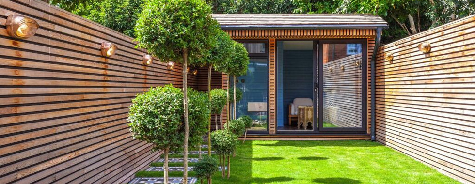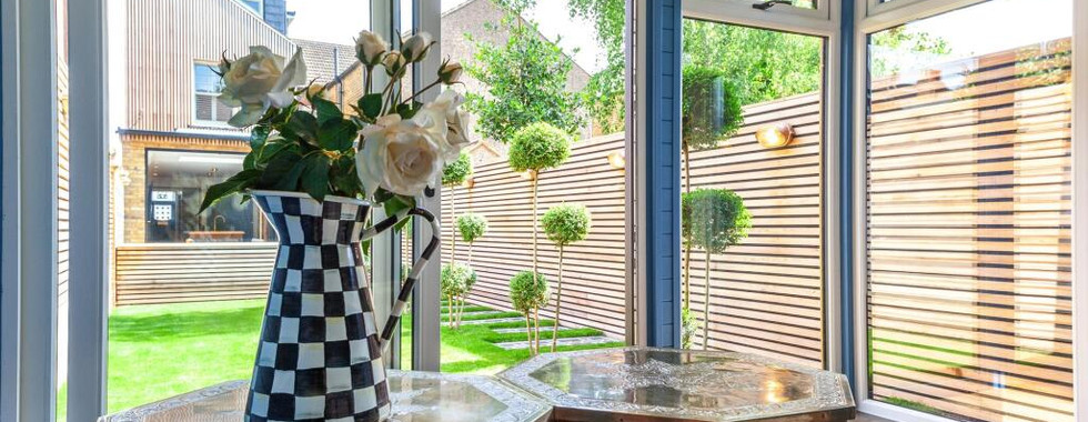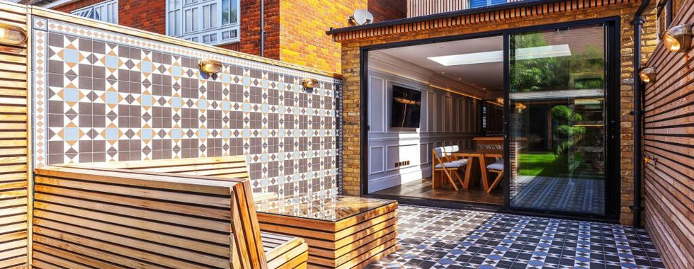 Landscaped Garden & Sun Terrace – Cedar fencing, bespoke seating, patterned tiled pathways, and manicured topiary.