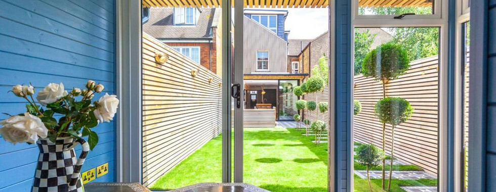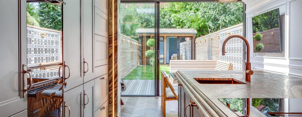 The south-west facing garden is a private sanctuary, with Victorian-style tiled pathways winding through the lawn and topiary to the garden room. Cedar fencing and brass lighting complete the refined outdoor space.