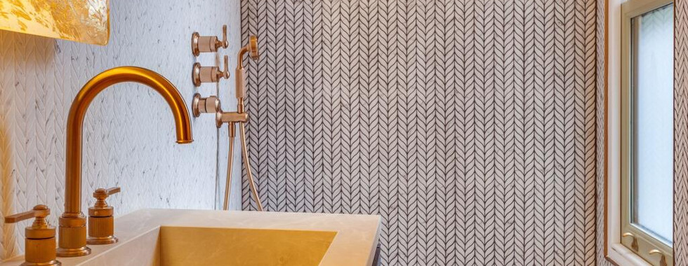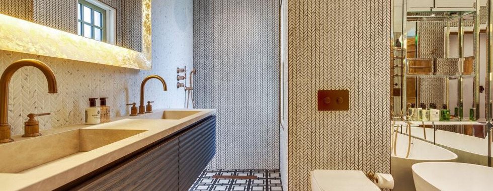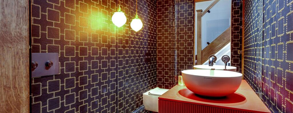 The ground floor also includes a bespoke guest cloakroom with contemporary brass fixtures and cleverly integrated storage, including a water softener.