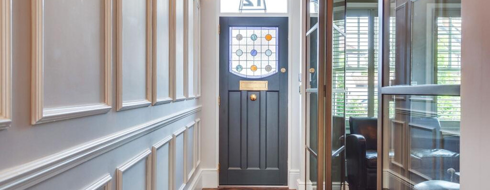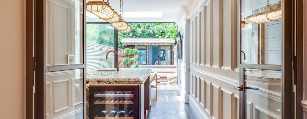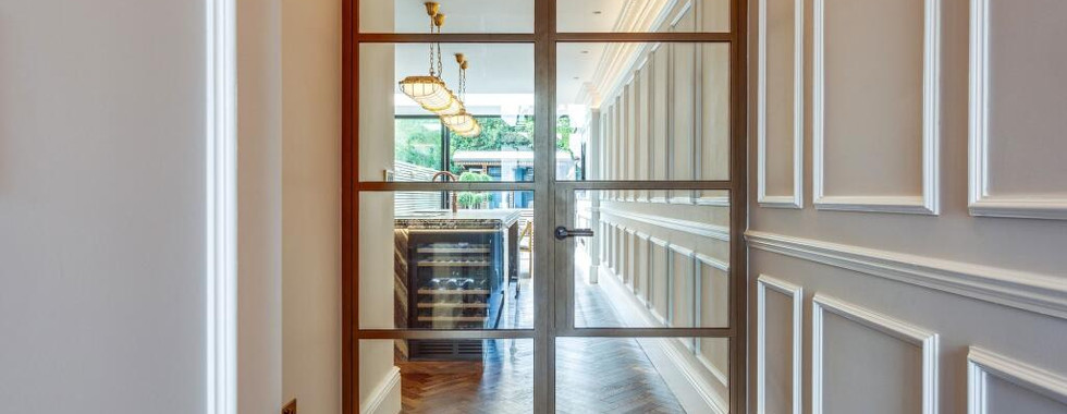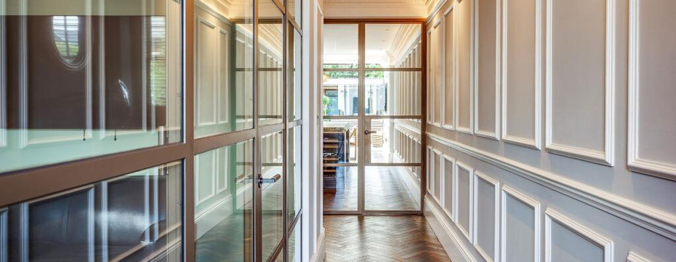 Victorian-Inspired Detailing – Traditional panelled walls, plaster coving, cast-iron fireplace, and crittall-style doors.