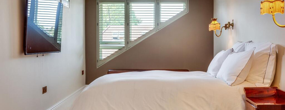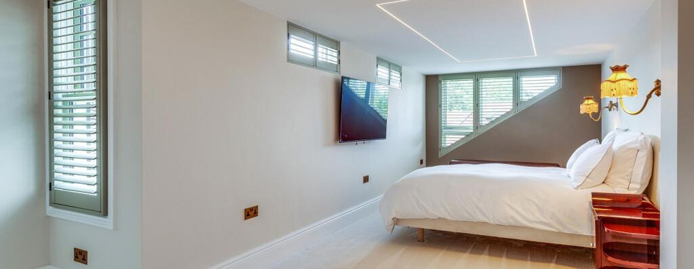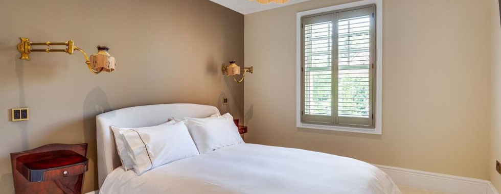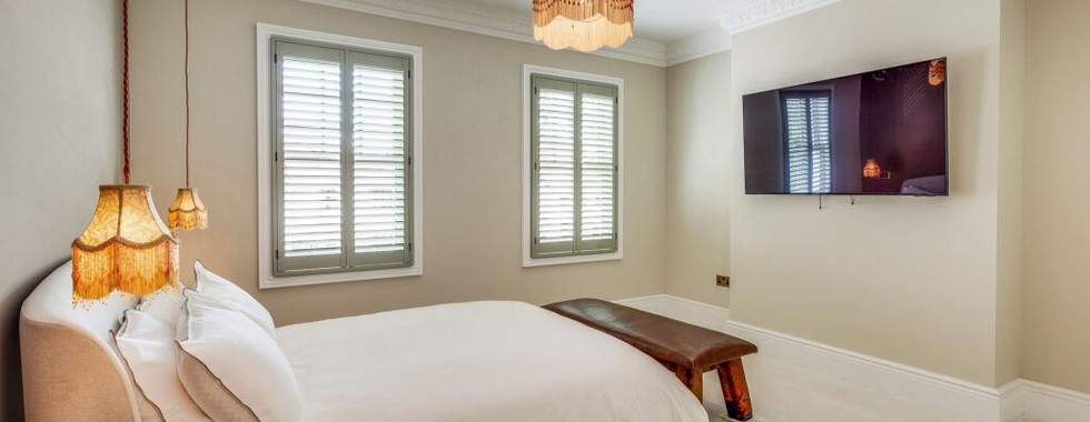 The entire top floor is dedicated to an indulgent principal suite. The bedroom is bathed in soft natural light and offers peaceful views, while the ensuite impresses with Fired Earth limestone and porcelain finishes, walk-in shower, brass fixtures, and additional loft storage.