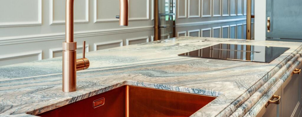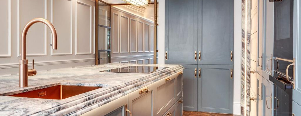 Spectacular Open-Plan Kitchen – Italian marble island, Siemens appliances, Quooker tap, wine fridge, and bespoke cabinetry.