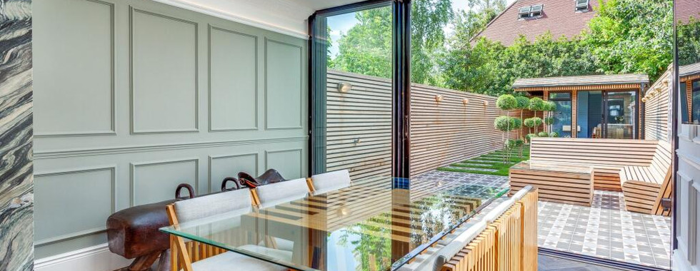 Two Crittall-style glass room dividers lead into a welcoming lounge, arranged around a traditional Victorian cast-iron fireplace with marble hearth—creating an intimate yet stylish retreat. Expansive sliding doors open onto a beautifully crafted sun terrace featuring bespoke seating, solid brass lighting, and a feature privacy wall—ideal for entertaining or quiet relaxation.