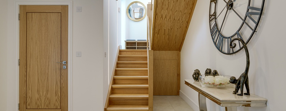 The principal suite is a sanctuary of comfort, complete with a spacious en-suite bathroom. Three additional large bedrooms include one with its own en-suite, all complemented by a sleek, contemporary family bathroom. A solid oak staircase leads to an airy hallway that integrates a built-in office space—perfect for those working from home.