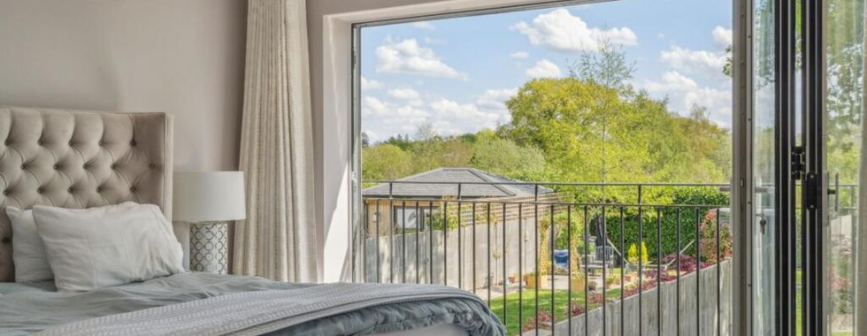 Upstairs, the first floor features a stunning principal suite with walk-in wardrobes and an en suite bathroom. The suite also includes bi-folding doors that open onto a Juliet balcony, allowing natural light to pour in and offering charming views of the rear garden and countryside beyond. A standout feature of the en suite is the large ‘smart glass’ panel, which turns from clear to opaque at the touch of a button—offering both privacy and a connection to the outdoors. Another generous double bedroom with en suite and built-in wardrobes also benefits from views over East Common.