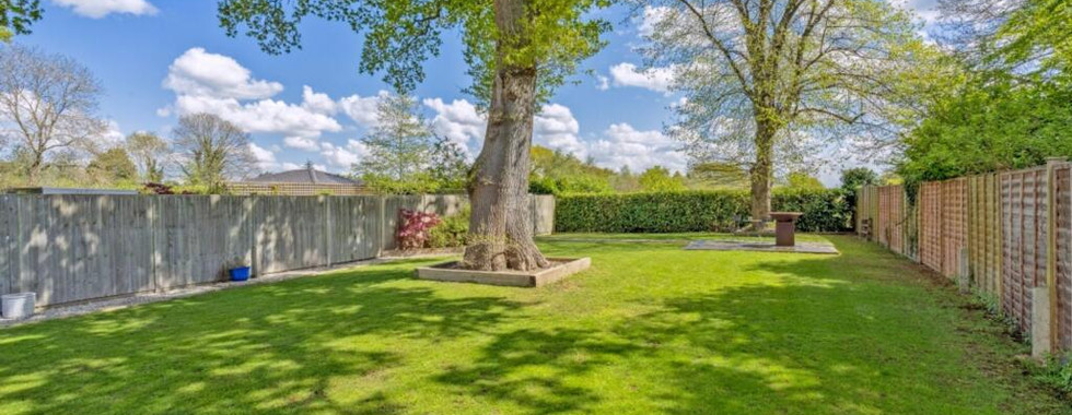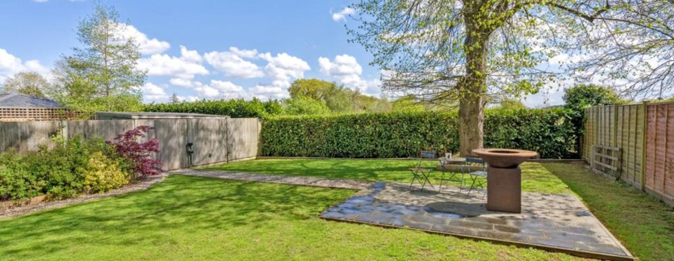 The landscaped rear garden features a sunken terrace directly behind the house and a second patio area at the far end—perfect for enjoying the late afternoon and evening sun. Off-street parking is available at the front, while the rear garden extends over 100 feet and backs onto open fields, offering privacy and a peaceful backdrop.