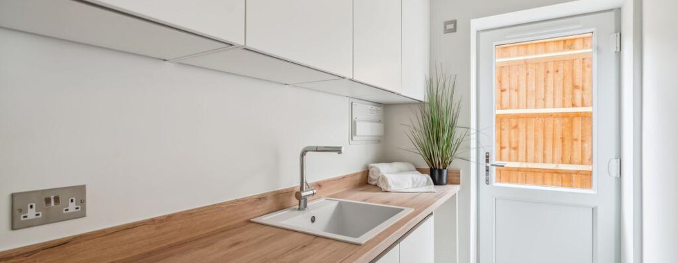The bespoke Paul Alexander kitchen features painted shaker cabinetry, state-of-the-art appliances, sleek work surfaces, generous storage, and a central island with space for bar stools – ideal for casual dining. A practical utility room provides additional space for laundry and outdoor access. At the front of the house, the snug with its attractive bay window creates a versatile reception area, filled with natural light – equally suited for relaxing or entertaining. A cloakroom completes the ground floor.