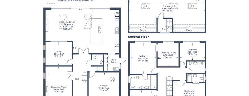The ground floor comprises a generous entrance hall with access to all reception areas. Double doors lead to a spacious sitting room with a feature fireplace. The newly fitted kitchen/breakfast room offers a fantastic space, incorporating high-quality craftsmanship, ample dining space, and soft furnishings. There are three large glass floor to ceiling pains onlooking the rear garden. A useful utility room with a side door is perfect for country walks. An internal door leads to the integral double garage. A cloakroom and study complete the ground floor.