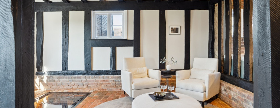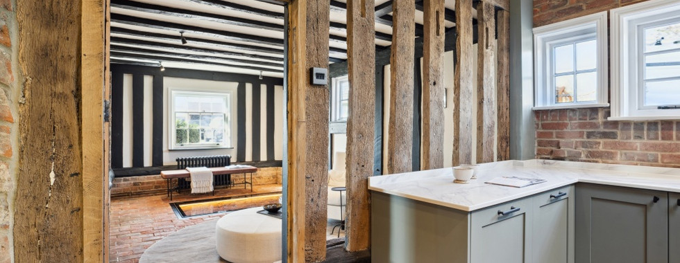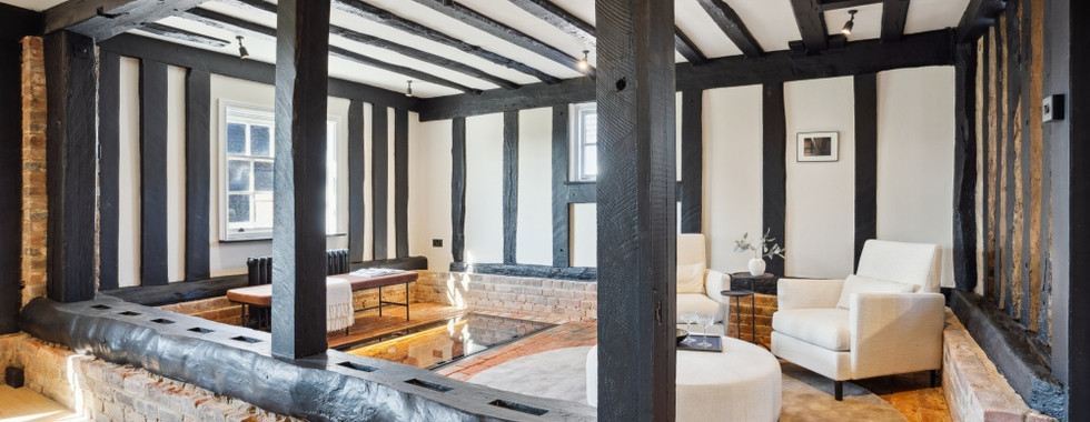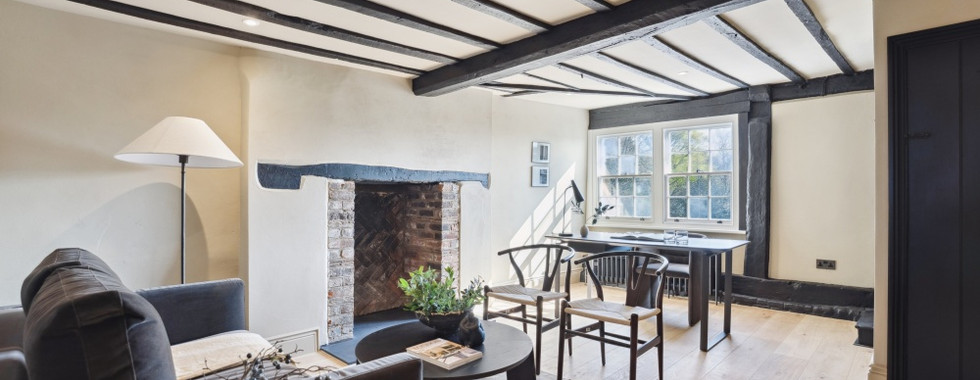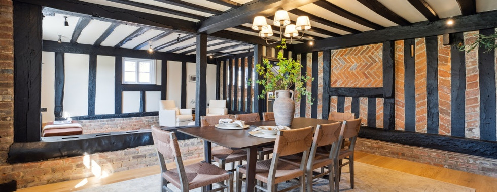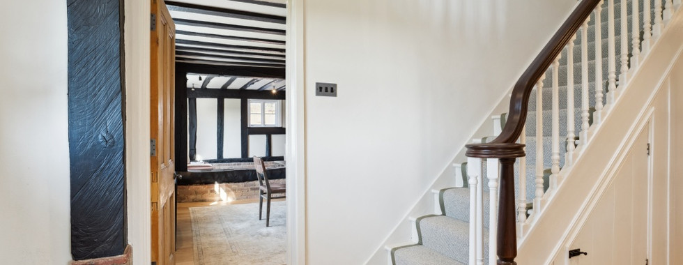 The entrance opens to a bright and welcoming hallway, with stairs, complete with bespoke runner, leading to the first floor. The elegant drawing room, with its double aspect, boasts a beamed ceiling and a cosy log burner, perfect for winter nights, along with exceptional views over the landscaped front garden and rolling Hertfordshire hills. The dining and family rooms are superb spaces with brick and beamed walls and ceilings, providing a great entertaining area, with the added highlight of access to the fabulous Georgian wine cellar, via a glazed pneumatic hatch.