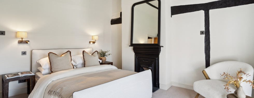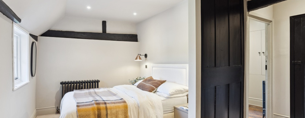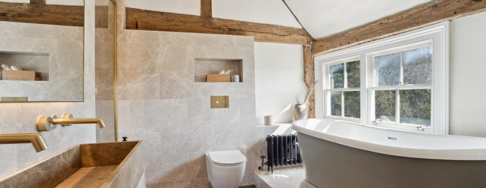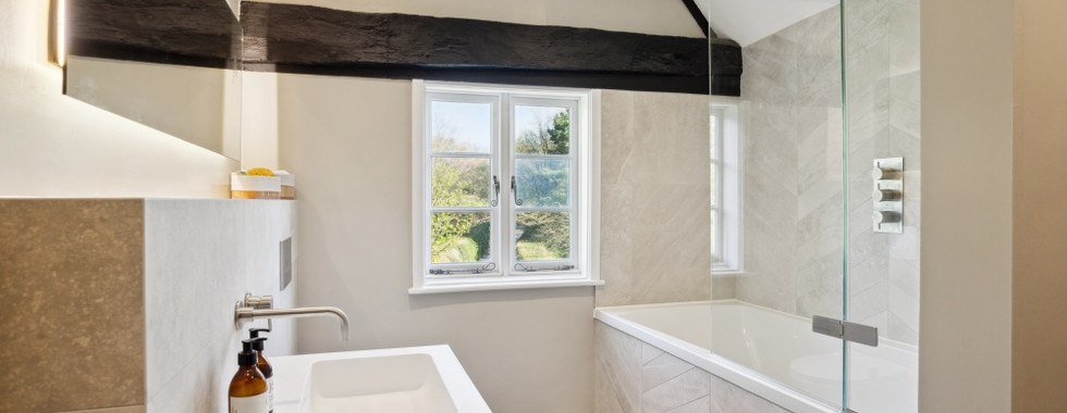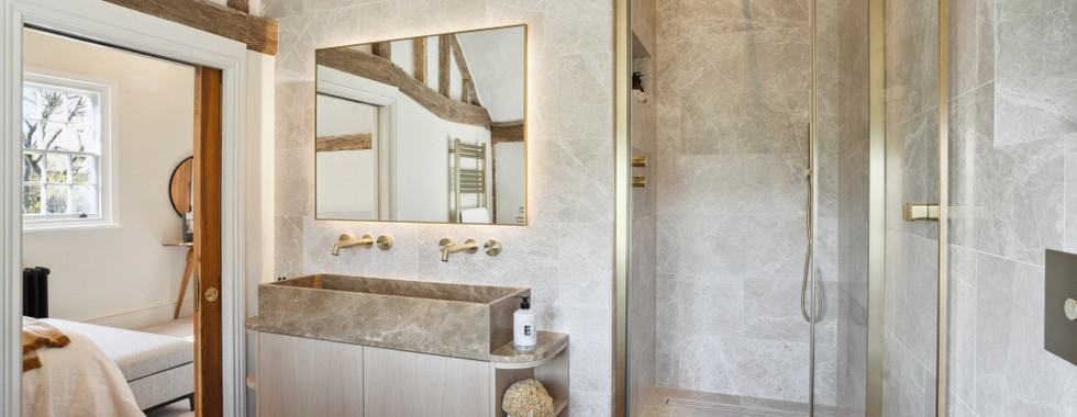 Stairs rise to the first-floor landing, where there is access to a part-boarded loft space. The principal bedroom has a double-height, vaulted ceiling and unrivalled views over the farmland. It benefits from a generous walk-in dressing room and a luxurious en-suite bathroom, complete with a custom-sprayed roll-top bath, Porcini Emperador marble tiling, shower, WC, bespoke marble sink, oak veneer vanity, and brushed brass hardware by JTP. The guest bedroom boasts a walk-in wardrobe and a beautifully finished en-suite. There are two further double bedrooms and a family bath/shower room of exceptional quality.
