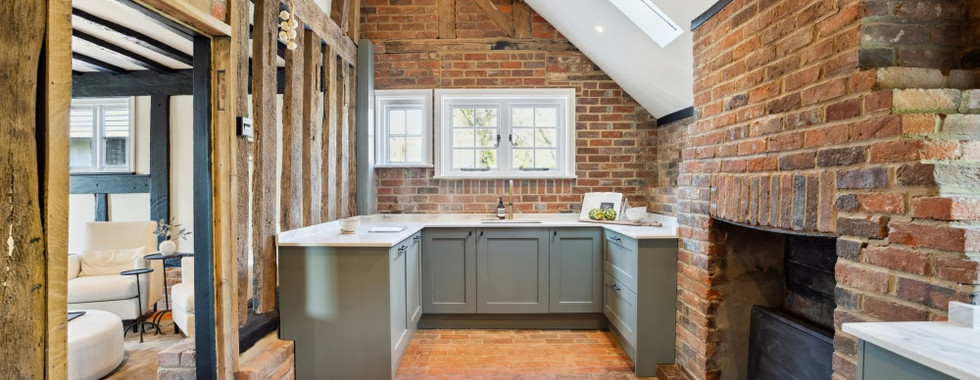 The study/bedroom five, with its beamed ceiling and built-in utility cupboards, enjoys views over the surrounding fields. An inner hall leads to a beautifully appointed cloakroom, a plant room, and access to the sizeable rear garden. The bespoke contemporary shaker kitchen has been thoughtfully designed, featuring a range of built-in wall and floor units with quartz worktops, complemented by integrated Siemens appliances, including an induction hob with concealed extractor, two ovens (one with microwave function), dishwasher, fridge-freezer, and a Quooker boiling water tap. The vaulted, beamed ceiling enhances the ambience, while the room also features an attractive fireplace, original quarry tiled flooring, and exposed brick walls. There is also a large storage loft.