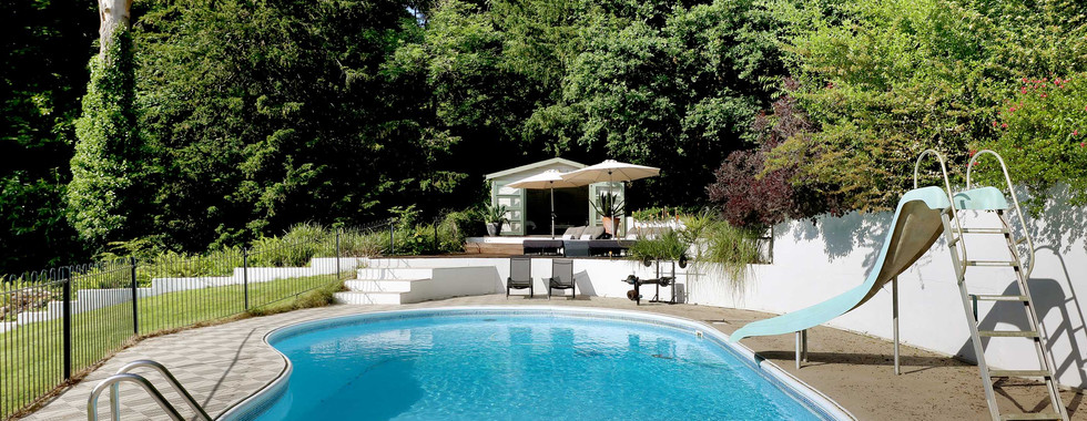 The property is set back 80 metres from the road, accessed via a shared driveway, and offers ample parking for several vehicles. Mature trees and hedge borders create a parkland-like atmosphere, ensuring privacy. The rear garden includes a large lawn, a heated swimming pool with an adjacent terrace, and a pool house, making it perfect for summer entertaining.