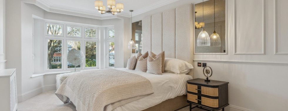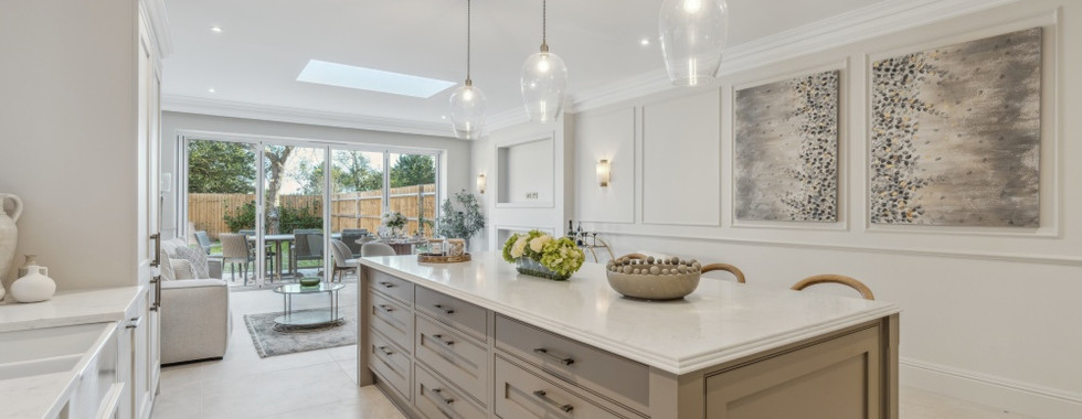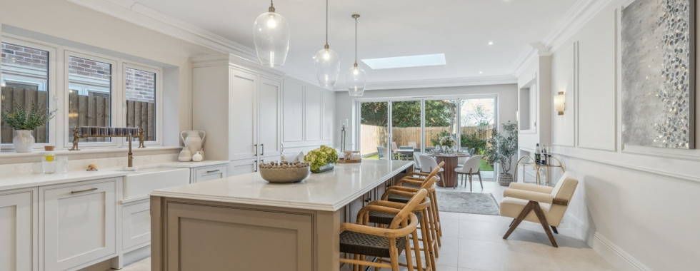 Upon entering, the hallway immediately sets the tone with its traditional wood panelling, bespoke designer staircase, and elegant coving and skirting. To the front of the home, the sitting room provides a cosy retreat with its bay window and feature fireplace. A separate double-aspect study offers a versatile space for remote work or relaxation. The luxurious kitchen-dining room at the rear is the heart of the home, featuring hand-painted Paul Alexander in-frame Shaker-style cabinetry, a pantry, and branded appliances, including a Rangemaster induction oven. The kitchen is further enhanced by quartz worktops, a kitchen island, a pot filler tap, and bi-fold doors that open to the landscaped garden, creating a perfect space for family living and entertaining. A utility room, with matching in-frame cabinetry, a butler sink, and branded washer and dryer, sits just off the kitchen, while a cloakroom completes the ground floor.