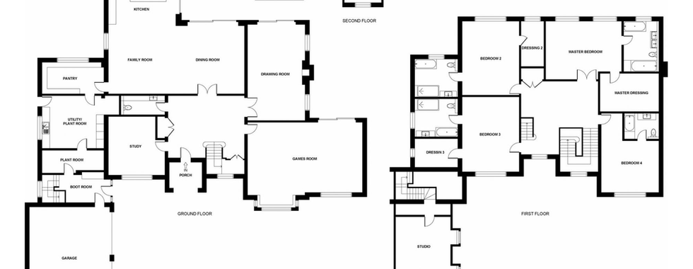 Ground Floor: Entrance porch, entrance hall, cloakroom, games room, drawing room, study, expansive kitchen/dining/family room, walk-in pantry, utility room, plant room, boot room, and a large integral garage.